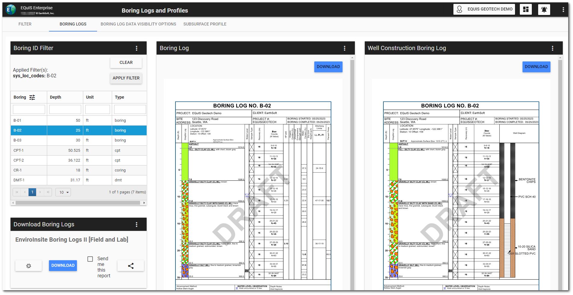 The Boring Logs tab on the dashboard is designed to populate Boring Log(s) and Well Construction Log(s) based on location(s) selected by the user.