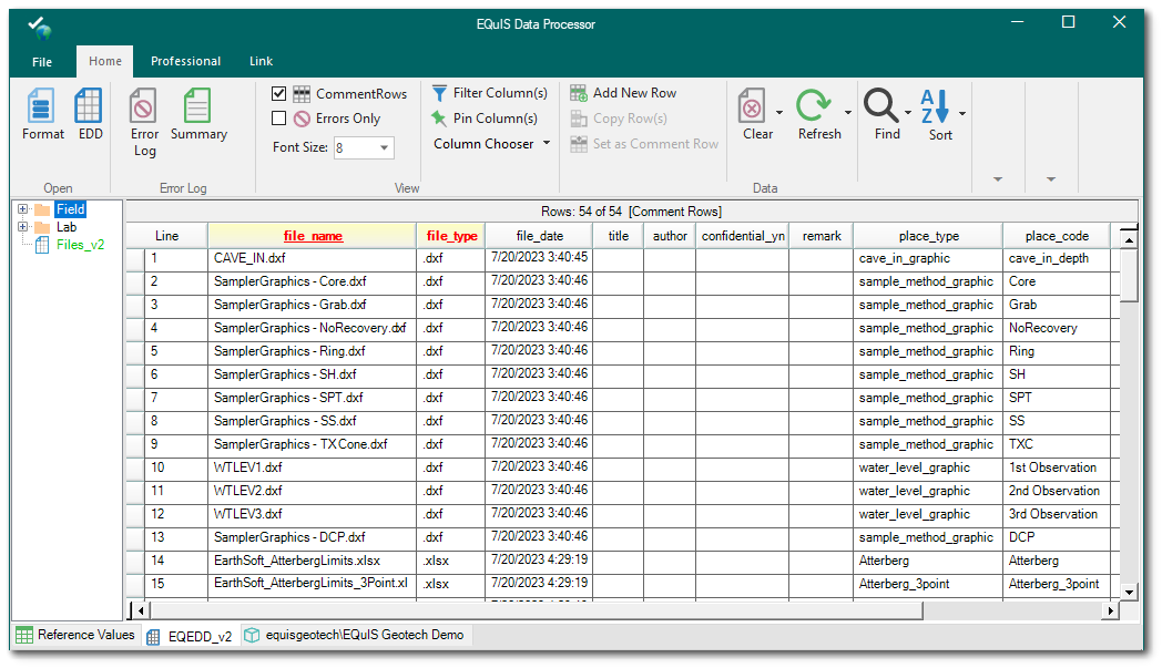 To assist with this configuration, the EQuIS Geotech DT_FILE_EDD_EQEDD_v2.zip file is an EDD designed to load the files using the EQEDD_v2 format and contains the appropriate DT_FILE.PLACE_TYPE and DT_FILE.PLACE_CODE values for each file where needed. Refer to the EQuIS Geotech Files on the ECC description for more information on what this EDD file contains.
