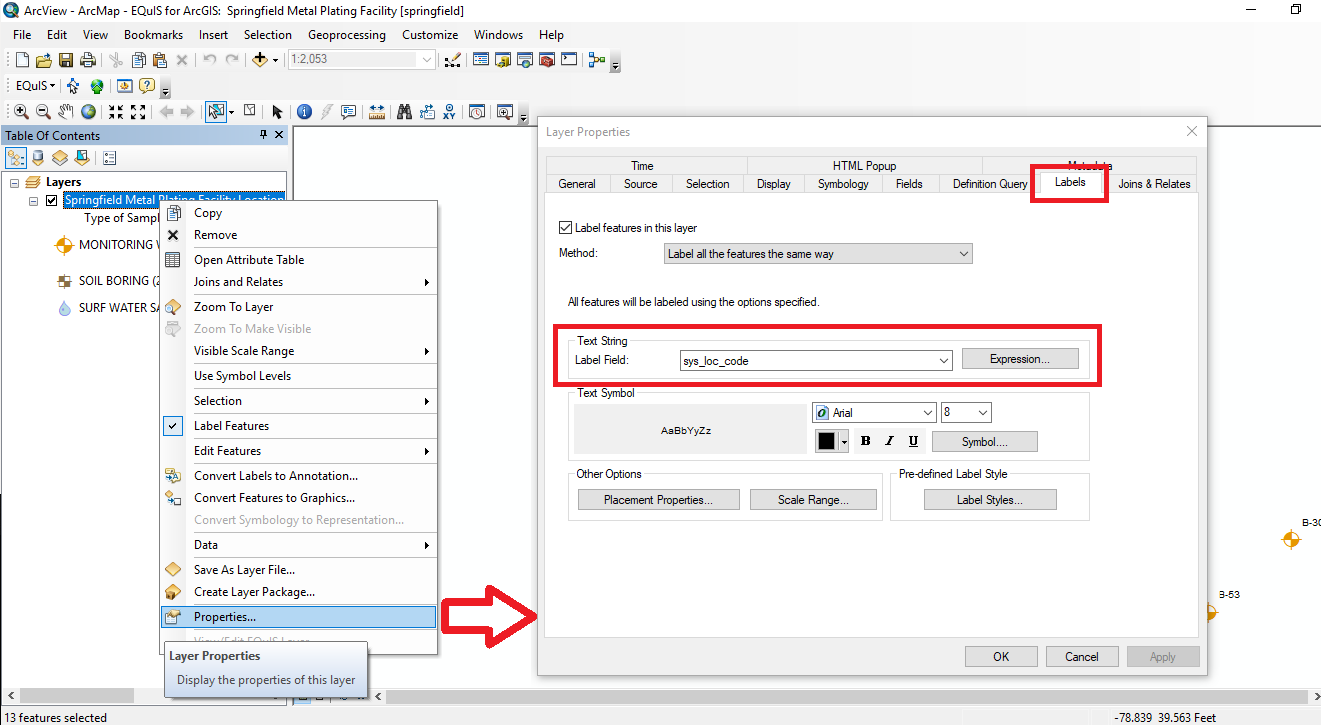 << Click to Display Table of Contents >> Navigation: Professional > Interfaces > Graphics Interfaces > EQuIS for ArcGIS > EQuIS for ArcGIS - Labeling Features |